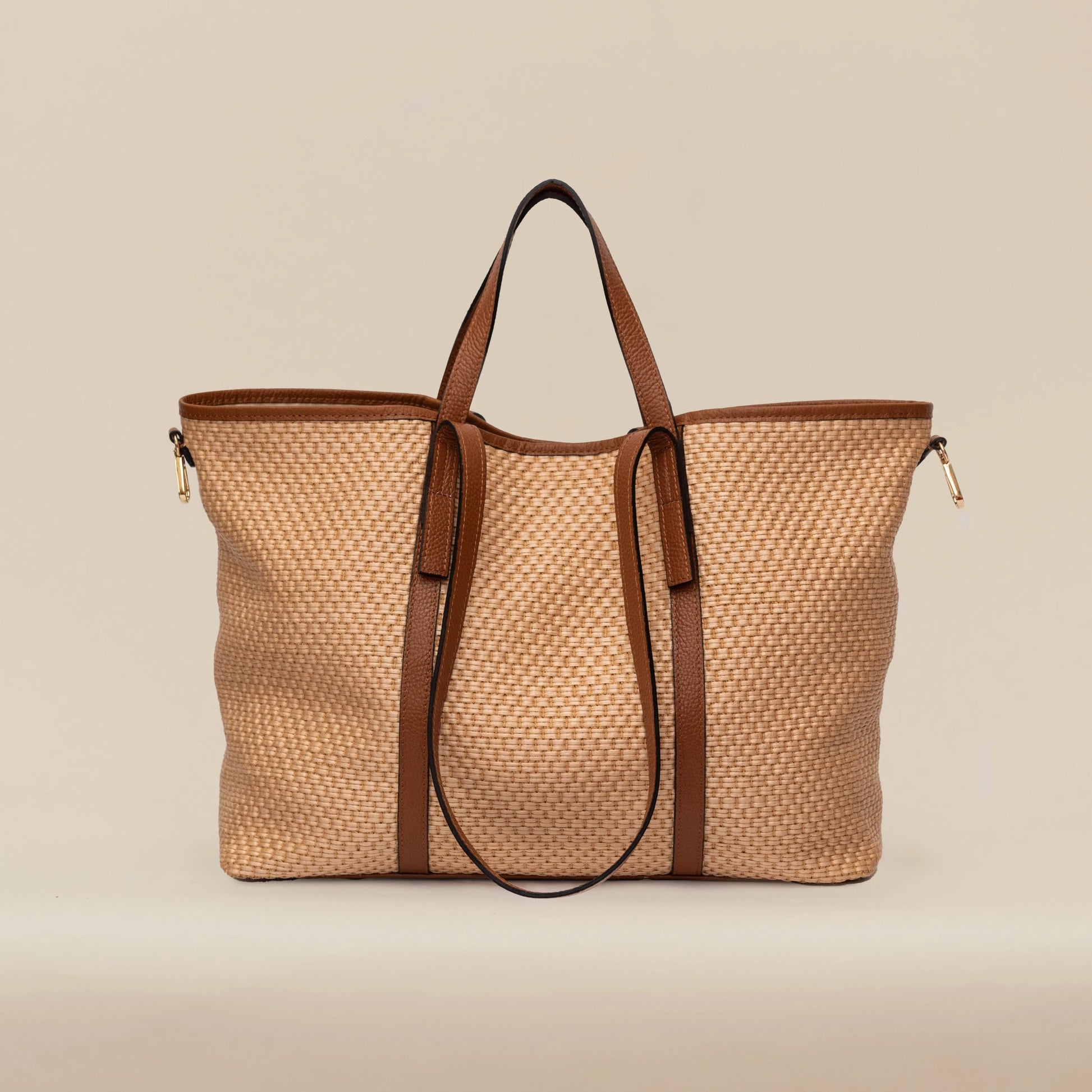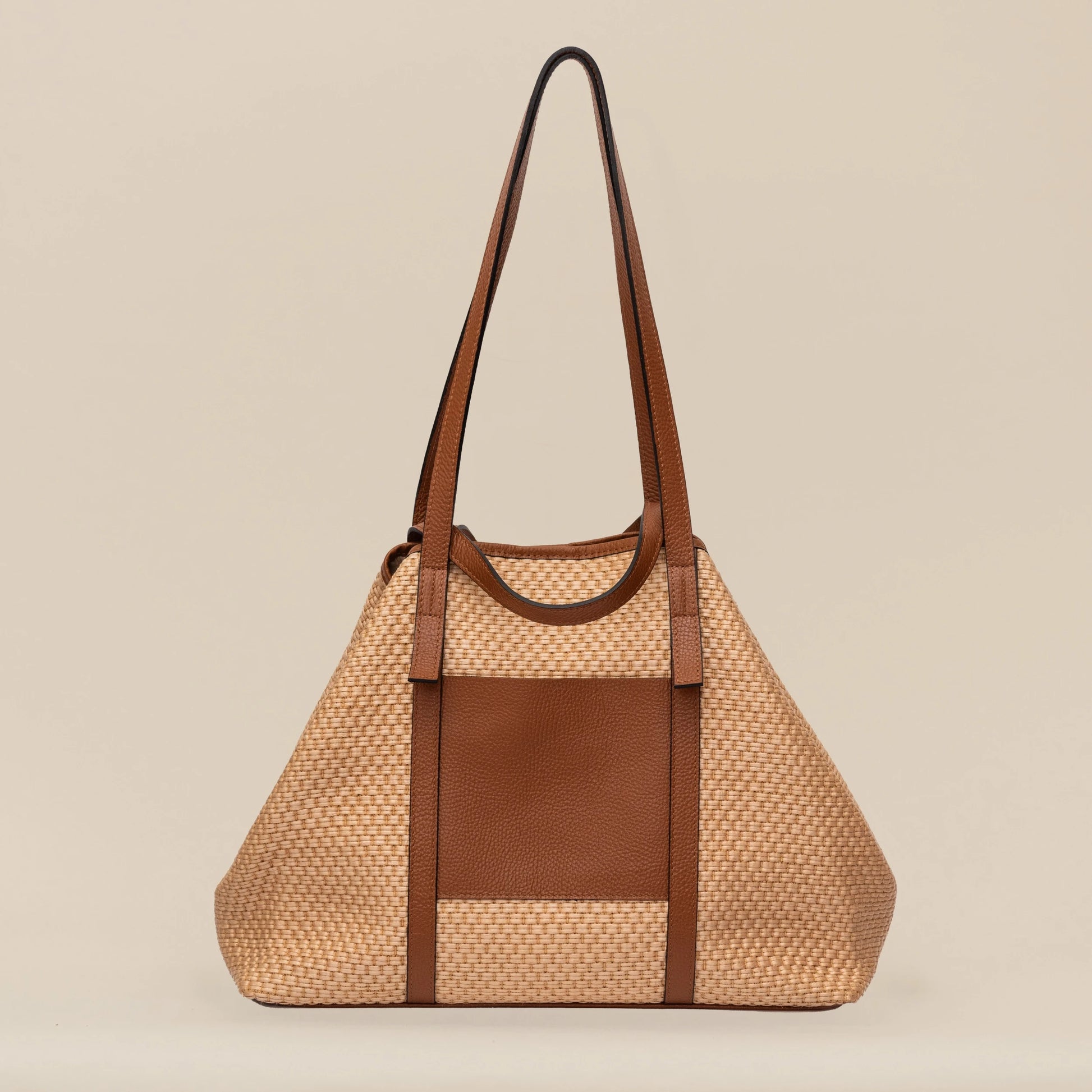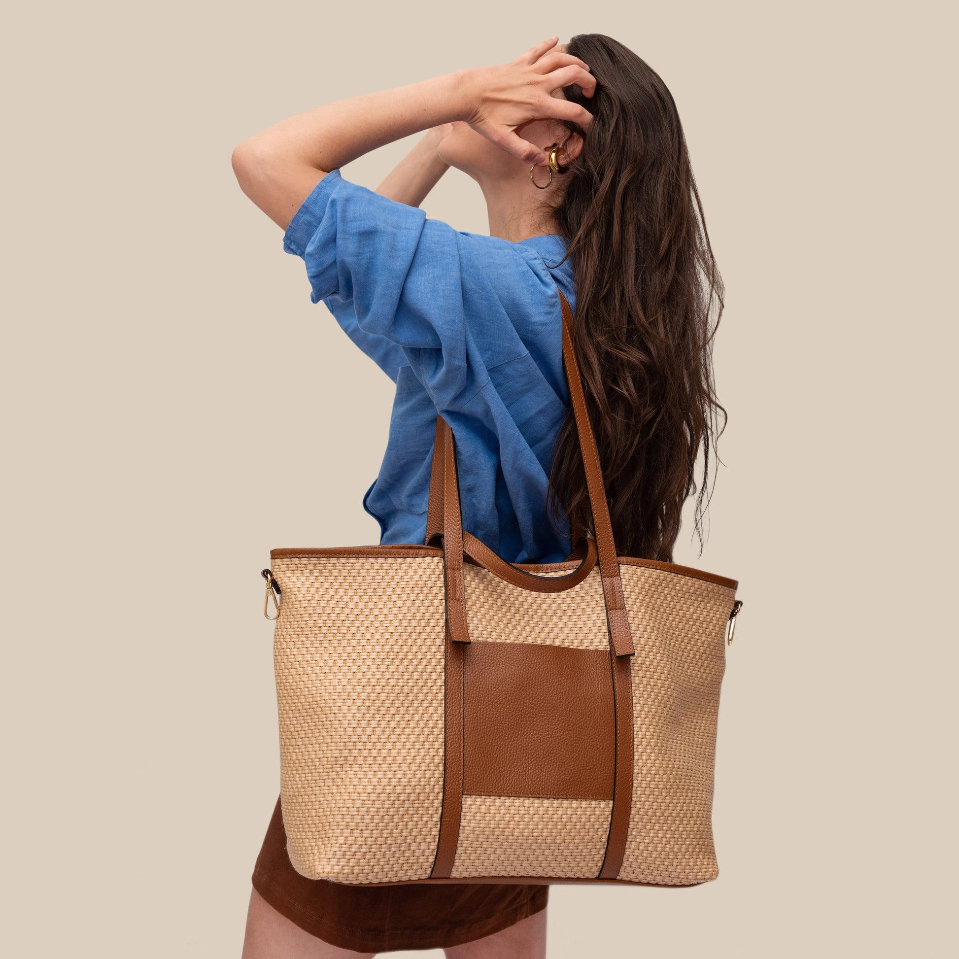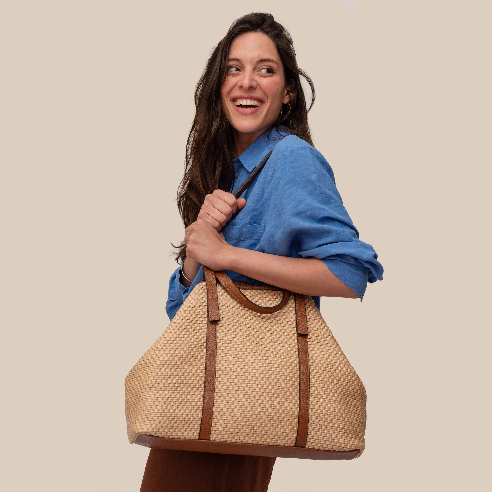 Gaia is the largest bag in the collection, built for those who need space without the bulk. Its raffia construction is soft and flexible yet maintains a sturdy structure, offering a silhouette that holds its shape while adapting to your needs: carry it as a spacious tote or use the snap hooks to adjust its form into a more compact everyday bag. Designed for work, travel, and everything in between, Gaia fits everything you need while keeping essentials within reach.